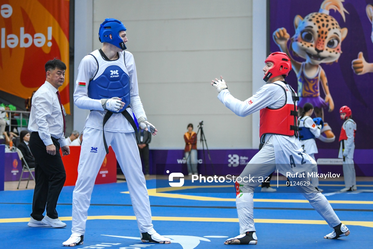 Sentyabrın 30-da III MDB Oyunları çərçivəsində Mingəçevirdəki “Kür” Olimpiya Tədris-İdman Mərkəzində taekvondo yarışları keçirilib. Kişilər arasında 80 kq çəki dərəcəsində yarışan belaruslu taekvondoçu Raman Turavinau (sol) Azərbaycan təmsilçisi Əli Əsədullayevi (sağ) 2:0 hesabı ilə məğlub edib.
