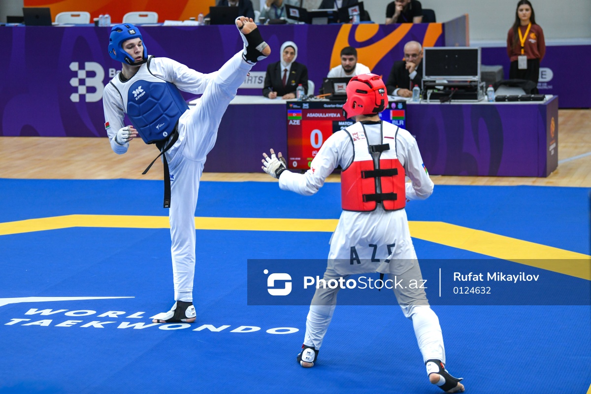 Sentyabrın 30-da III MDB Oyunları çərçivəsində Mingəçevirdəki “Kür” Olimpiya Tədris-İdman Mərkəzində taekvondo yarışları keçirilib. Kişilər arasında 80 kq çəki dərəcəsində yarışan belaruslu taekvondoçu Raman Turavinau (sol) Azərbaycan təmsilçisi Əli Əsədullayevi (sağ) 2:0 hesabı ilə məğlub edib.