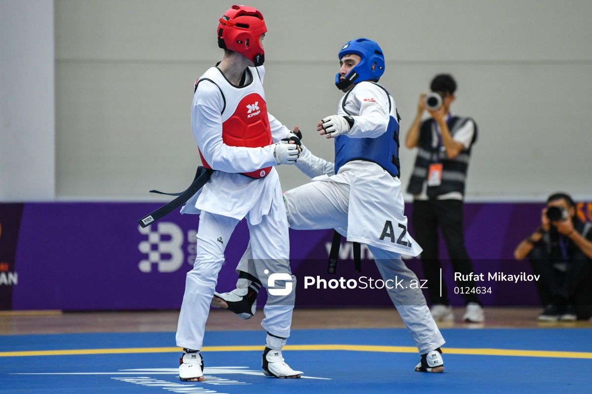 Sentyabrın 30-da III MDB Oyunları çərçivəsində Mingəçevirdəki “Kür” Olimpiya Tədris-İdman Mərkəzində taekvondo yarışları keçirilib. Kişilər arasında 68 kq çəki dərəcəsində yarışan Qazaxıstan təmsilçisi Anuar Mukhametkarymov (sol) azərbaycanlı taekvondoçu Vaqif Haciyevi (sağ) 2:0 hesabı ilə məğlub edib.