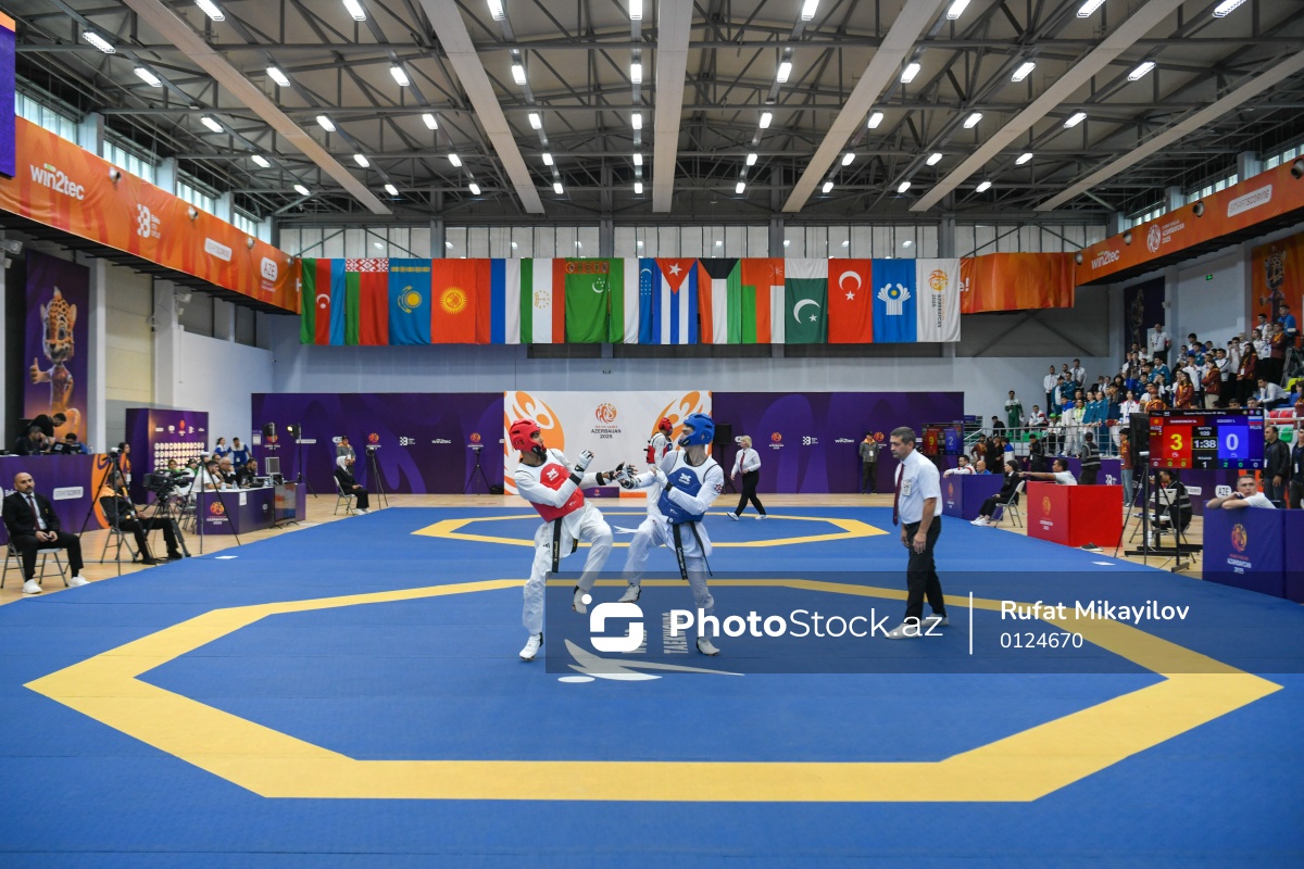 Sentyabrın 30-da III MDB Oyunları çərçivəsində Mingəçevirdəki “Kür” Olimpiya Tədris-İdman Mərkəzində taekvondo yarışları keçirilib. Kişilər arasında 58 kq çəki dərəcəsində yarışan qırğızıstanlı taekvondoçu Nurkhan Ryskeldievich Samidinov (sol) Rusiya təmsilçisi Igor Dzhioev (sağ) 2:1 hesabı ilə məğlub edib.