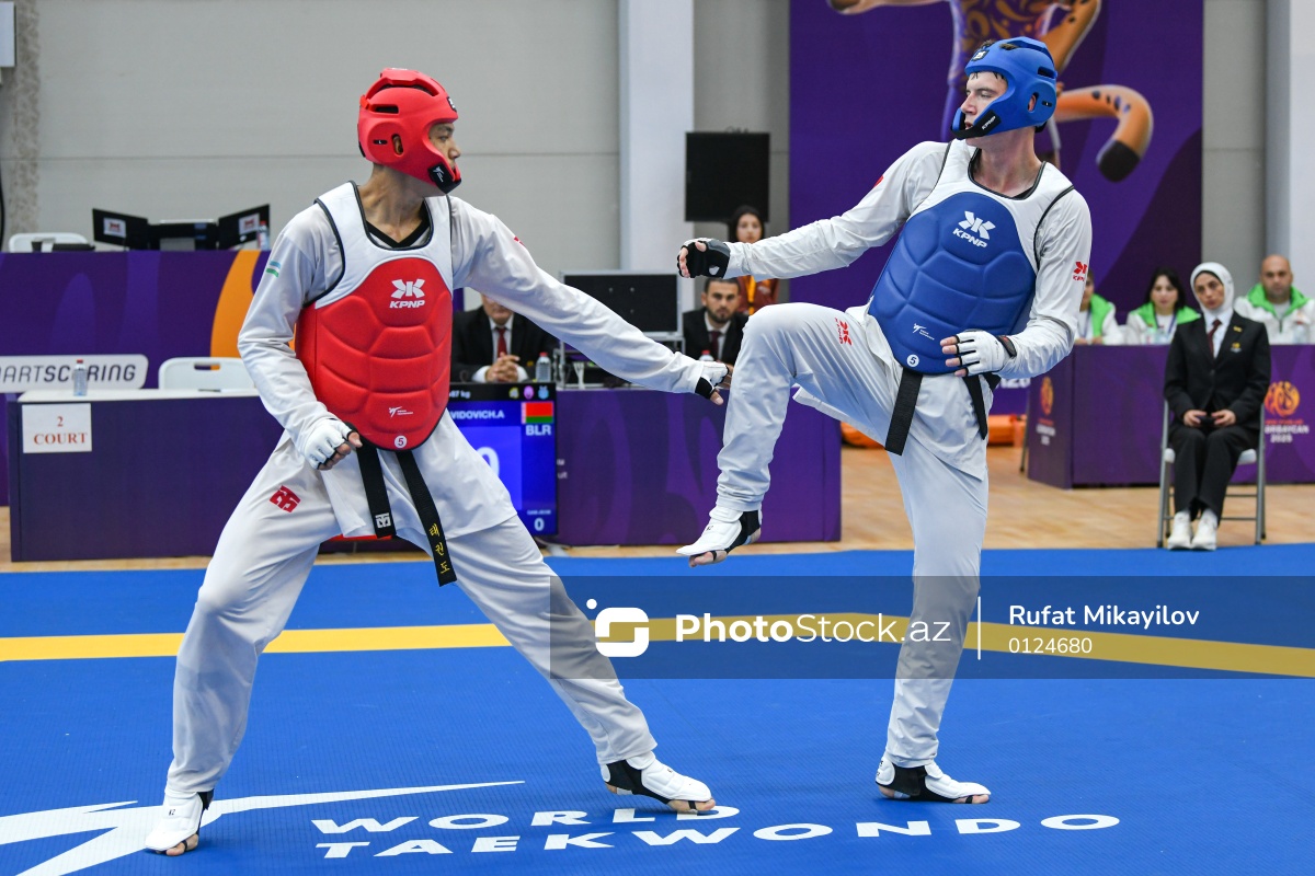 Sentyabrın 30-da III MDB Oyunları çərçivəsində Mingəçevirdəki “Kür” Olimpiya Tədris-İdman Mərkəzində taekvondo yarışları keçirilib. Kişilər arasında +87 kq çəki dərəcəsində yarışan özbəkistanlı taekvondoçu Khudoynazar Shodmonov (sol) Belarus təmsilçisi Aliaksei Davidovichi (sağ) 2:0 hesabı ilə məğlub edib.