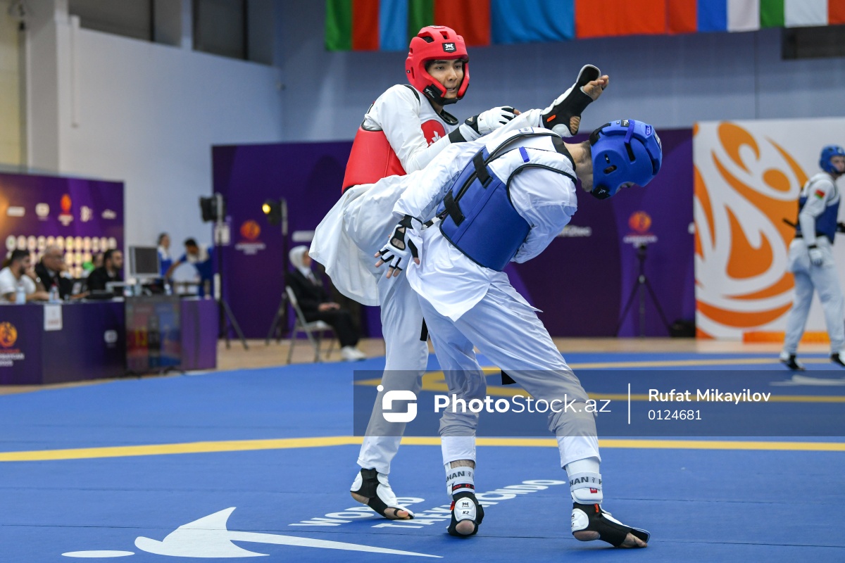 Sentyabrın 30-da III MDB Oyunları çərçivəsində Mingəçevirdəki “Kür” Olimpiya Tədris-İdman Mərkəzində taekvondo yarışları keçirilib. Kişilər arasında 58 kq çəki dərəcəsində yarışan qırğızıstanlı taekvondoçu Nurkhan Ryskeldievich Samidinov (sol) Rusiya təmsilçisi Igor Dzhioev (sağ) 2:1 hesabı ilə məğlub edib.