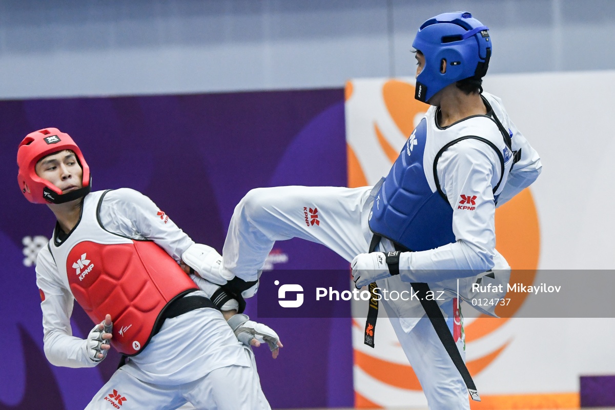 Sentyabrın 30-da III MDB Oyunları çərçivəsində Mingəçevirdəki “Kür” Olimpiya Tədris-İdman Mərkəzində taekvondo yarışları keçirilib. Kişilər arasında 68 kq çəki dərəcəsində yarışan Qırğızıstan taekvondoçusu Ramazan Dyikanbaev (sol) Azərbaycan təmsilçisi Vasif Səlimova (sağ) 0:2 hesabı ilə məğlub olub.