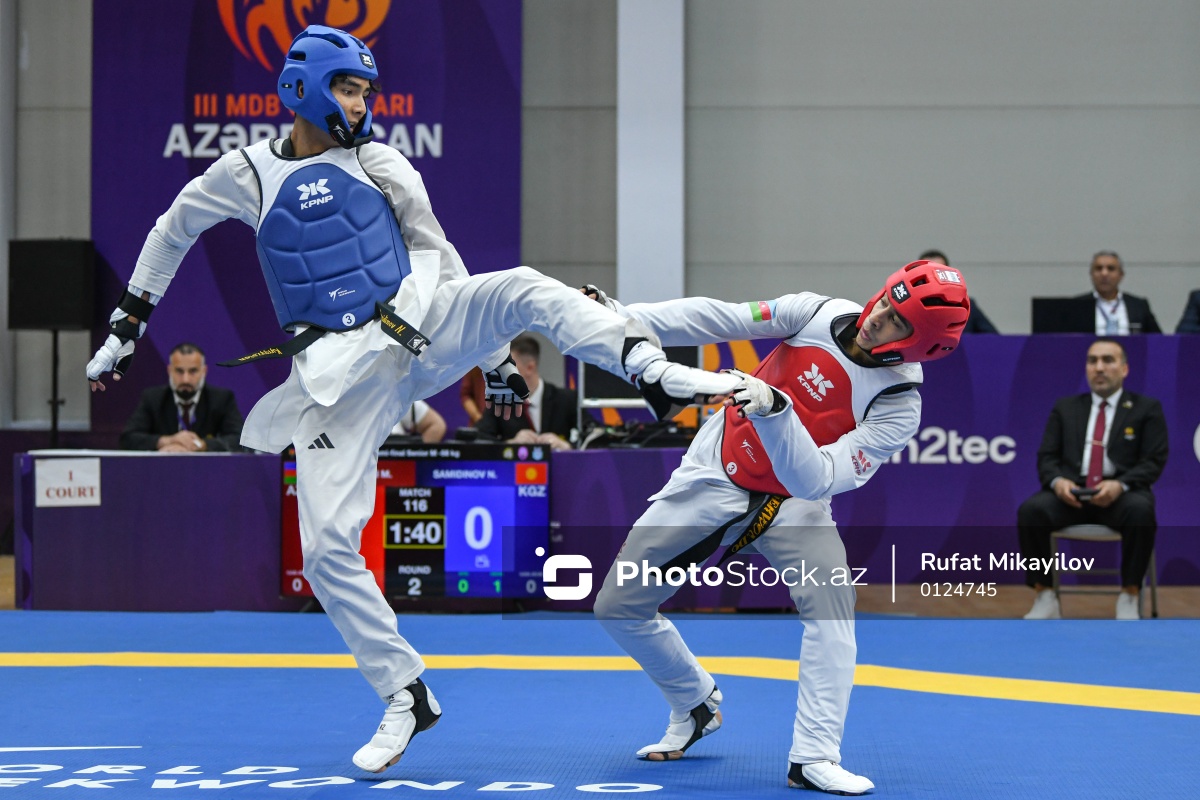 Sentyabrın 30-da III MDB Oyunları çərçivəsində Mingəçevirdəki “Kür” Olimpiya Tədris-İdman Mərkəzində taekvondo yarışları keçirilib. Kişilər arasında 58 kq çəki dərəcəsində yarışan Qırğızıstan taekvondoçusu Nurkhan Ryskeldievich Samidinov (sol) azərbaycanlı idmançı Məhəmməd Həsənlini (sağ) 2:0 hesabı ilə məğlub edib.