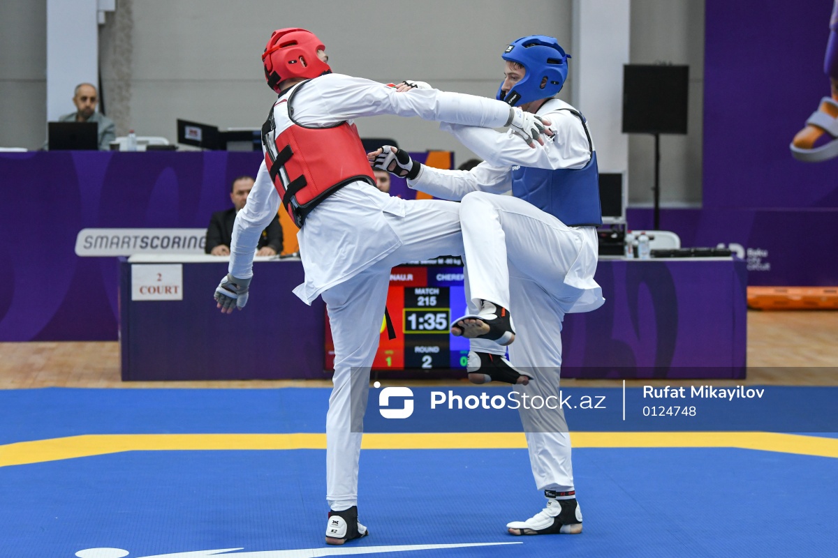 Sentyabrın 30-da III MDB Oyunları çərçivəsində Mingəçevirdəki “Kür” Olimpiya Tədris-İdman Mərkəzində taekvondo yarışları keçirilib. Kişilər arasında 58 kq çəki dərəcəsində yarışan azərbaycanlı idmançı Məhəmməd Həsənli (sol) Qırğızıstan taekvondoçusu Nurkhan Ryskeldievich Samidinova (sağ) 0:2 hesabı ilə məğlub olub.