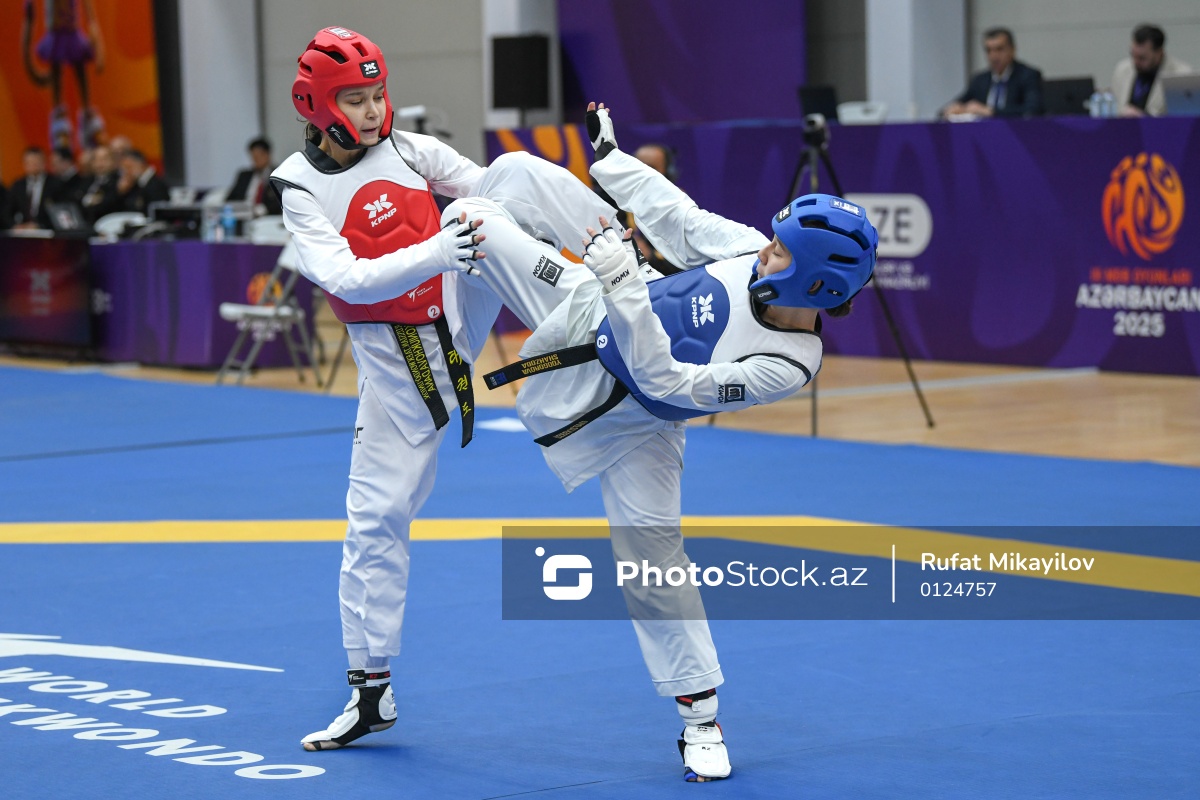 Sentyabrın 30-da III MDB Oyunları çərçivəsində Mingəçevirdəki “Kür” Olimpiya Tədris-İdman Mərkəzində taekvondo yarışları keçirilib. Qadınlar arasında 49 kq çəki dərəcəsində yarışan Rusiya taekvondoçusu Dana Koniukhova (sol) Özbəkistan təmsilçisi Shahzoda Yodgorova (sağ) 2:1 hesabı ilə məğlub edib.