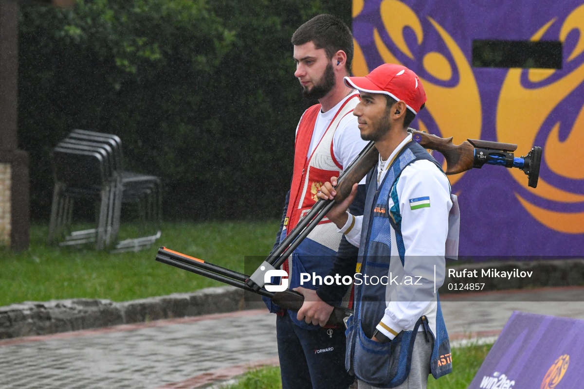 III MDB Oyunlarında stend atıcılığı üzrə yarışlarda iştirak edən Rusiya atıcısı Ilia Kushagin (sol) və Özbəkistan atıcısı Bekhruz Sharapov (sağ).