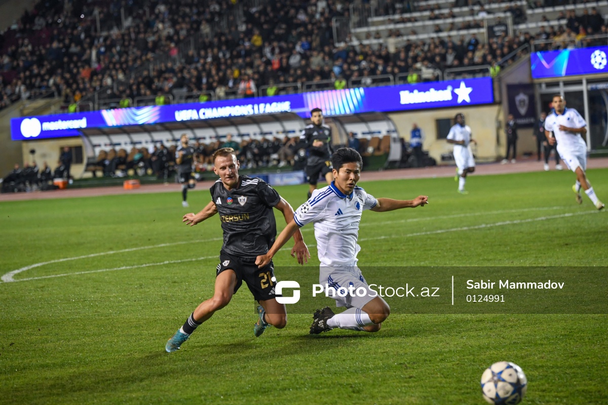 01.10.2025 Tofiq Bəhramov adına Respublika stadionu, UEFA Çempionlar Liqasının “Qarabağ” - “Kopenhagen" oyununda “Qarabağ”ın oyunçusu Aleksey Kaşuk (solda) və “Kopenhagen"in oyunçusu Junnosuke Suzuki (sağda).
