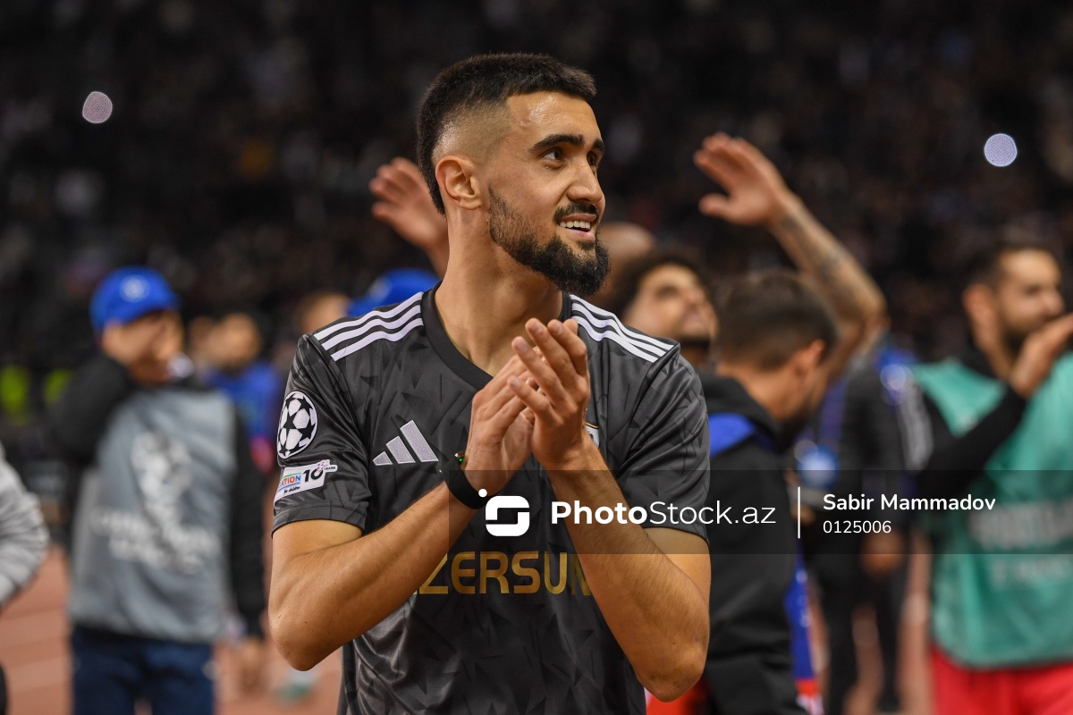 01.10.2025 Tofiq Bəhramov adına Respublika stadionu, UEFA Çempionlar Liqasının “Qarabağ” - “Kopenhagen" oyununda “Qarabağ”ın futbolçusu Toral Bayramov qələbə sevincini qeyd edir.