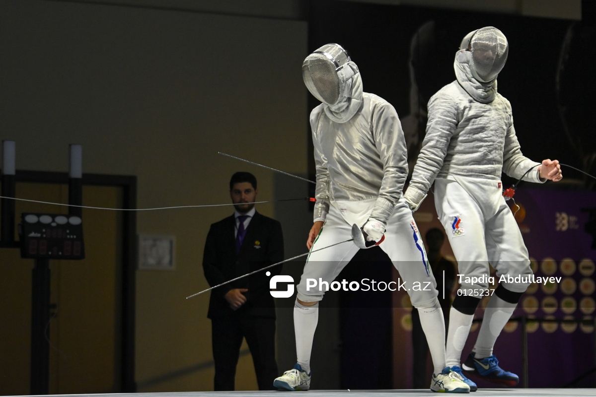 Oktyabrın 2-də III MDB Oyunları çərçivəsində Gəncə İdman Sarayında qılıncoynatma üzrə yarışlar baş tutub. Özbəkistan idmançısı Sardor Abdukarimbekov (sol) Rusiya təmsilçisi Petr Taichenachevə (sağ) 14:15 hesabı ilə məğlub olub.