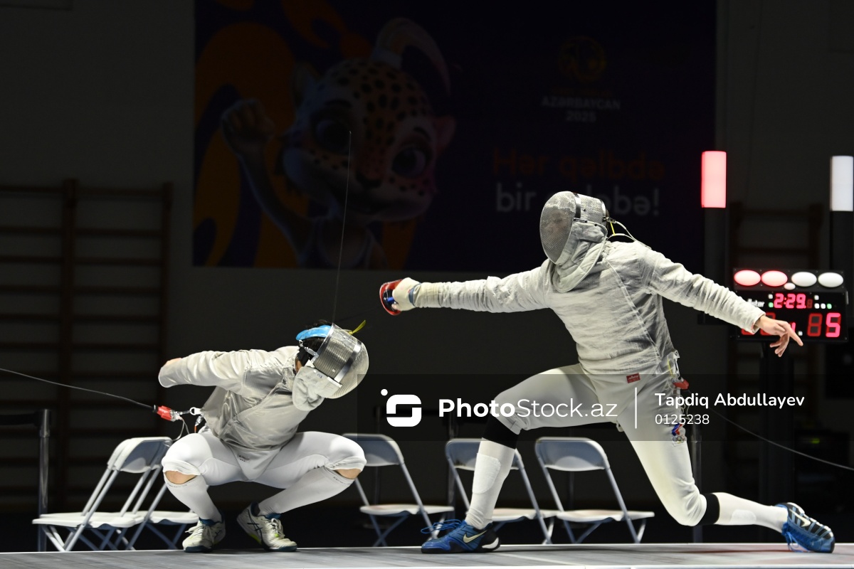Oktyabrın 2-də III MDB Oyunları çərçivəsində Gəncə İdman Sarayında qılıncoynatma üzrə yarışlar baş tutub. Özbəkistan idmançısı Sardor Abdukarimbekov (sol) Rusiya təmsilçisi Petr Taichenachevə (sağ) 14:15 hesabı ilə məğlub olub.