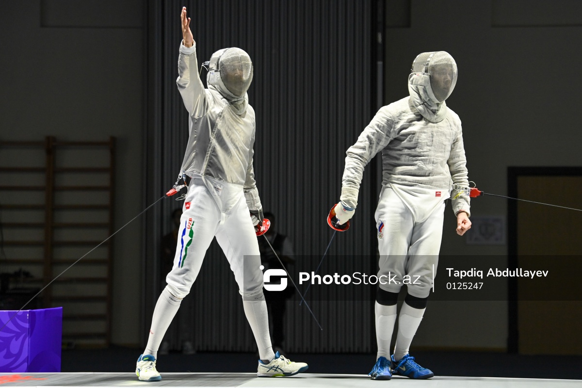 Oktyabrın 2-də III MDB Oyunları çərçivəsində Gəncə İdman Sarayında qılıncoynatma üzrə yarışlar baş tutub. Özbəkistan idmançısı Sardor Abdukarimbekov (sol) Rusiya təmsilçisi Petr Taichenachevə (sağ) 14:15 hesabı ilə məğlub olub.
