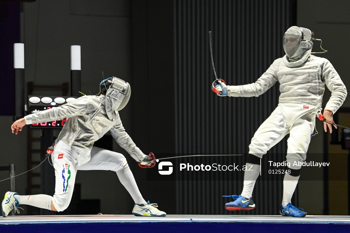 Oktyabrın 2-də III MDB Oyunları çərçivəsində Gəncə İdman Sarayında qılıncoynatma üzrə yarışlar baş tutub. Özbəkistan idmançısı Sardor Abdukarimbekov (sol) Rusiya təmsilçisi Petr Taichenachevə (sağ) 14:15 hesabı ilə məğlub olub.