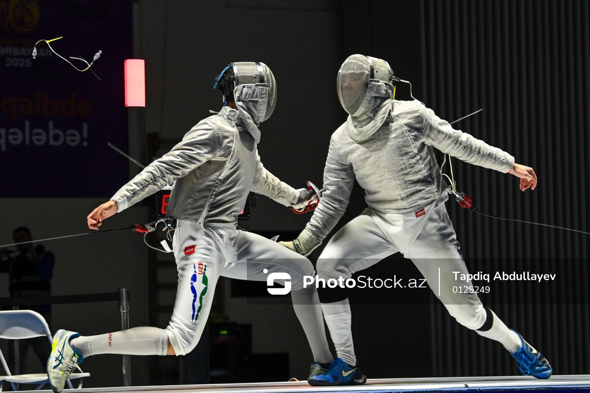 Oktyabrın 2-də III MDB Oyunları çərçivəsində Gəncə İdman Sarayında qılıncoynatma üzrə yarışlar baş tutub. Özbəkistan idmançısı Sardor Abdukarimbekov (sol) Rusiya təmsilçisi Petr Taichenachevə (sağ) 14:15 hesabı ilə məğlub olub.