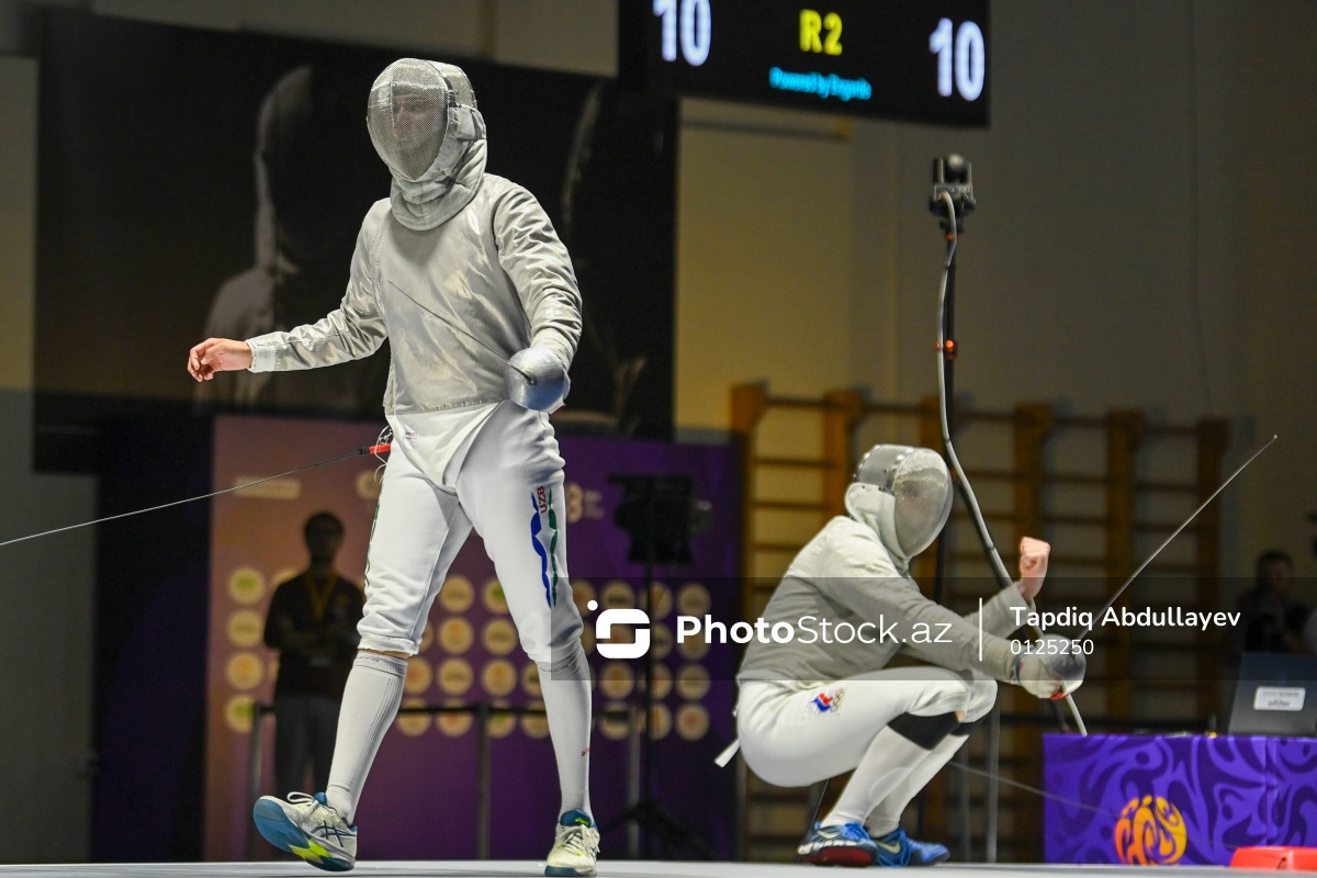 Oktyabrın 2-də III MDB Oyunları çərçivəsində Gəncə İdman Sarayında qılıncoynatma üzrə yarışlar baş tutub. Özbəkistan idmançısı Sardor Abdukarimbekov (sol) Rusiya təmsilçisi Petr Taichenachevə (sağ) 14:15 hesabı ilə məğlub olub.