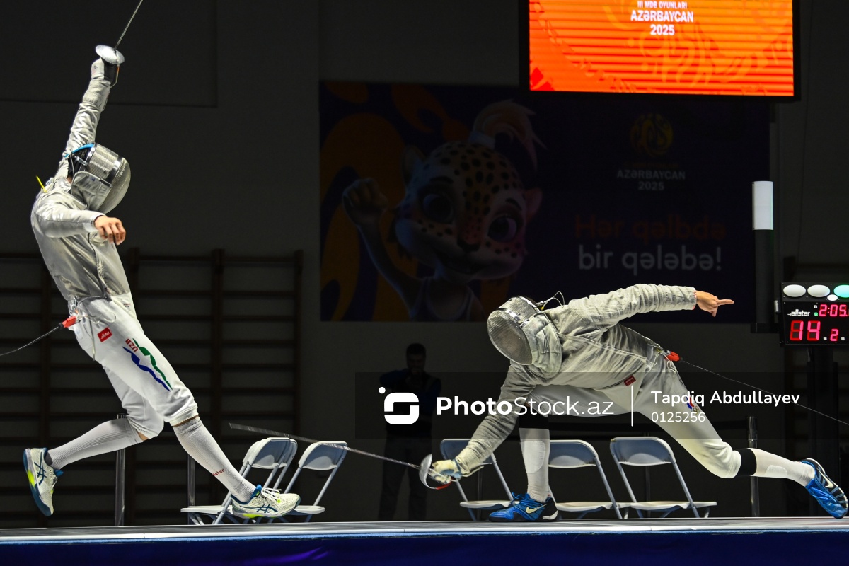 Oktyabrın 2-də III MDB Oyunları çərçivəsində Gəncə İdman Sarayında qılıncoynatma üzrə yarışlar baş tutub. Özbəkistan idmançısı Sardor Abdukarimbekov (sol) Rusiya təmsilçisi Petr Taichenachevə (sağ) 14:15 hesabı ilə məğlub olub.