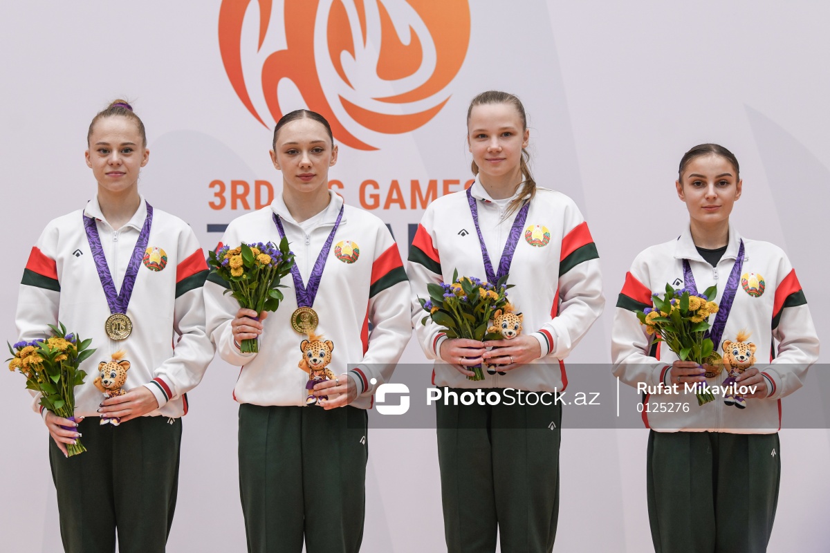 III MDB Oyunlarında batut gimnastikası üzrə yarışlarda qızıl medal qazanan Belarus idmançıları (soldan-sağa) Viyaleta Bardzilouskaya, Lana Lebedeva, Zlata Miniakhmetava və Katsiaryna Yarshova.