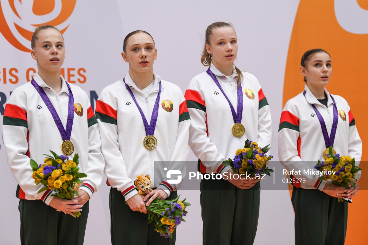 III MDB Oyunlarında batut gimnastikası üzrə yarışlarda qızıl medal qazanan Belarus idmançıları (soldan-sağa) Viyaleta Bardzilouskaya, Lana Lebedeva, Zlata Miniakhmetava və Katsiaryna Yarshova.