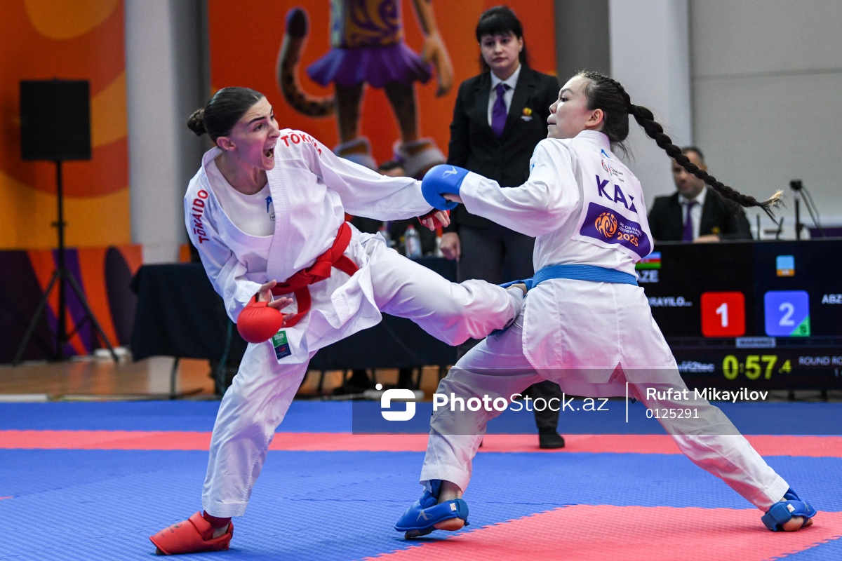 Oktyabrın 3-də III MDB Oyunları çərçivəsində "Kür" Olimpiya Tədris-İdman Mərkəzində karate yarışlarına start verilib. Qadınlar arasında 50 kq çəki dərəcəsində mübarizə aparan Azərbaycan təmsilçisi Fatimə Cəbrayılova (sol) Qazaxıstan karateçisi Malika Abzhanovaya (sağ) 1:3 hesabı ilə məğlub olub.