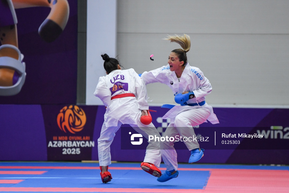 Oktyabrın 3-də III MDB Oyunları çərçivəsində "Kür" Olimpiya Tədris-İdman Mərkəzində karate yarışlarına start verilib. Qadınlar arasında 55 kq çəki dərəcəsində mübarizə aparan Özbəkistan karateçisi Sevinch Rakhimova (sol) Azərbaycan təmsilçisi Mədinə Sadiqovanı (sağ) 4:3 hesabı ilə məğlub edib.