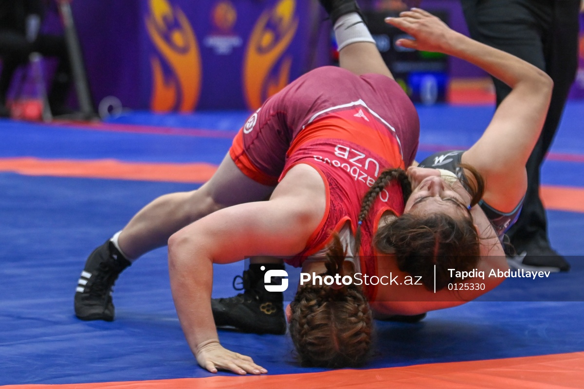Oktyabrın 3-də III MDB Oyunları çərçivəsində Gəncə Olimpiya İdman Kompleksində güləş üzrə yarışlar keçirilib. Qadınlar arasında 61 kq çəki dərəcəsində mübarizə aparan Özbəkistan təmsilçisi Laylo Orazboeva (sol) Azərbaycan güləşçisi Fidan Babayevaya (sağ) 2:7 hesabı ilə məğlub olub.