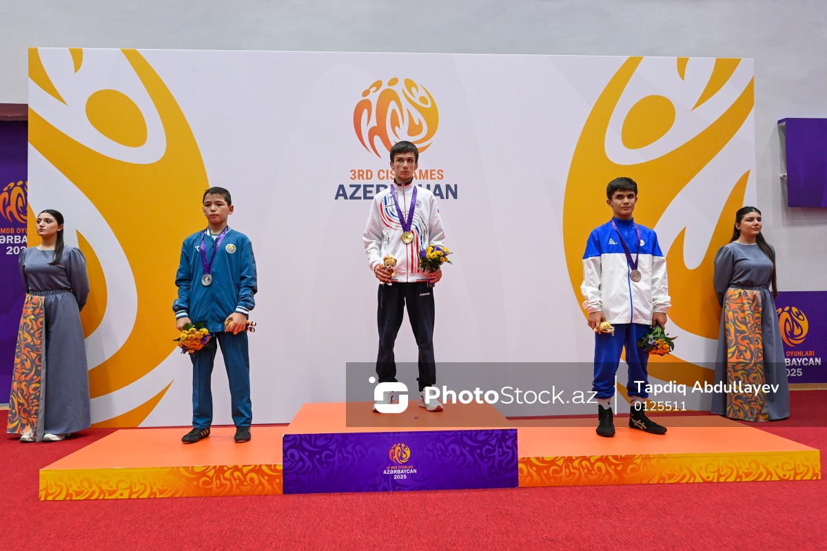 III MDB Oyunlarında 45 kq çəki dərəcəsində güləş üzrə yarışlarda (soldan-sağa) gümüş medal qazanan Özbəkistan güləşçisi Mukhammad Rakhimjonov, qızıl medal alan Rusiya təmsilçisi Islam Isabekov, bürünc medal qazanan Azərbaycan güləşçisi Hüseyn Rzazadə.