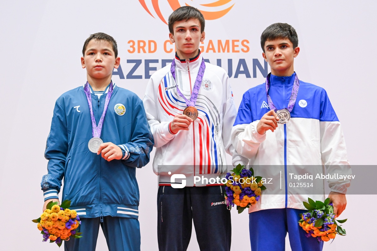III MDB Oyunlarında 45 kq çəki dərəcəsində güləş üzrə yarışlarda (soldan-sağa) gümüş medal qazanan Özbəkistan güləşçisi Mukhammad Rakhimjonov, qızıl medal alan Rusiya təmsilçisi Islam Isabekov, bürünc medal qazanan Azərbaycan güləşçisi Hüseyn Rzazadə.