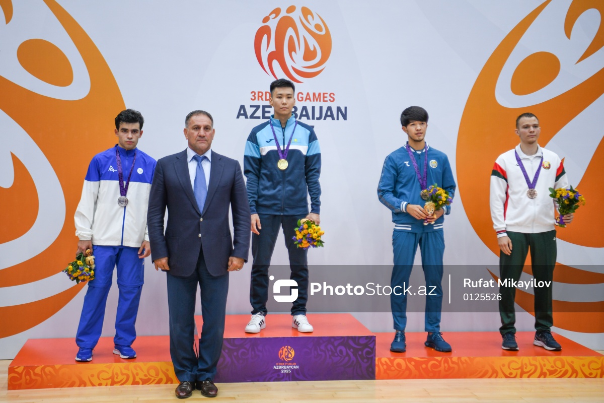 III MDB Oyunlarında 60 kq çəki dərəcəsində karate yarışlarında (soldan-sağa) gümüş medal qazanan Azərbaycan karateçisi Fərid Savadov, Azərbaycan Karate Federasiyasının vitse-prezidenti Füzuli Musayev, qızıl medal qazanan Qazaxıstan təmsilçisi Darkhan Timraliyev, bürünc medal qazananlar Özbəkistan karateçisi Mekhriddin Turakhonov və Belarus təmsilçisi Maksim Kashyrski.