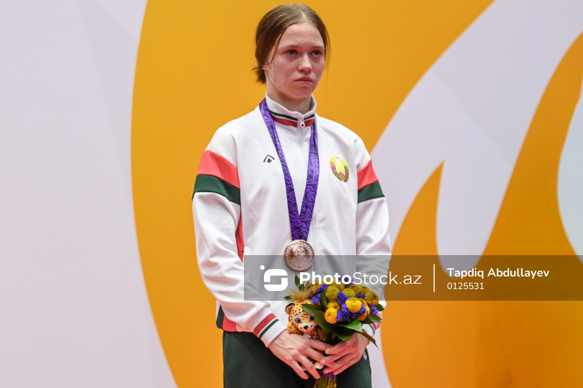 III MDB Oyunlarında 46 kq çəki dərəcəsində güləş üzrə yarışlarda bürünc medal qazanan Belarus güləşçisi Nahornaya Darya.