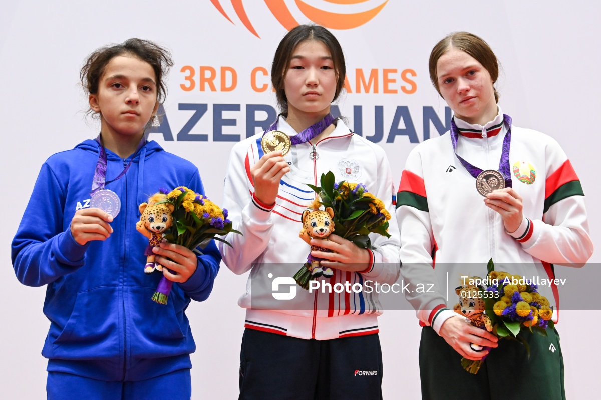 III MDB Oyunlarında 46 kq çəki dərəcəsində güləş üzrə yarışlarda (soldan-sağa) gümüş medal qazanan Azərbaycan güləşçisi Nəzrin Əhmədli, qızıl medal alan Rusiya təmsilçisi Irina Tsydeeva, bürünc medal qazanan Belarus güləşçisi Nahornaya Darya.