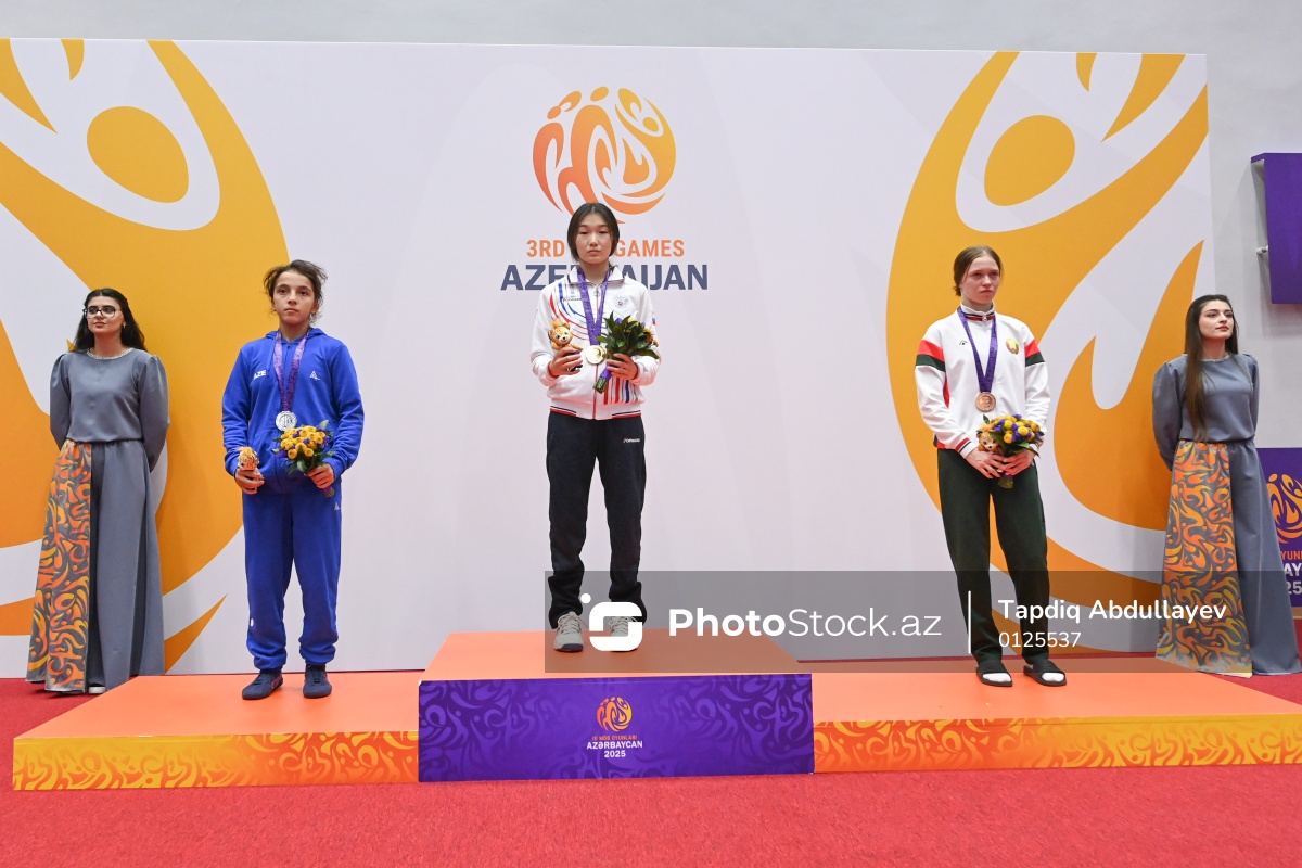 III MDB Oyunlarında 46 kq çəki dərəcəsində güləş üzrə yarışlarda (soldan-sağa) gümüş medal qazanan Azərbaycan güləşçisi Nəzrin Əhmədli, qızıl medal alan Rusiya təmsilçisi Irina Tsydeeva, bürünc medal qazanan Belarus güləşçisi Nahornaya Darya.