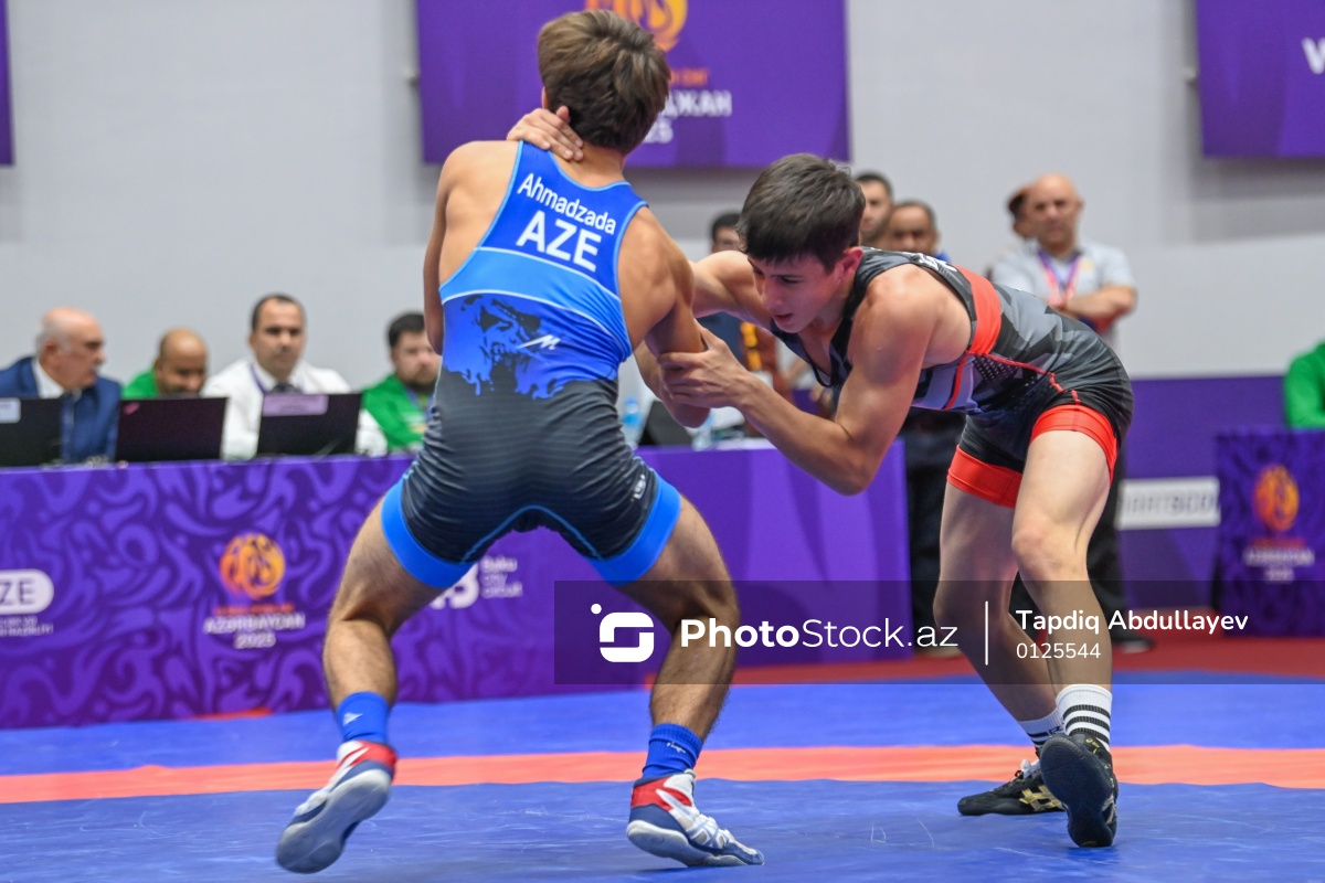Oktyabrın 3-də III MDB Oyunları çərçivəsində Gəncə Olimpiya İdman Kompleksində güləş üzrə yarışlar keçirilib. Kişilər arasında 51 kq çəki dərəcəsində mübarizə aparan Azərbaycan güləşçisi Hacihüseyn Əhmədzadə (sol) Rusiya təmsilçisi Tembulat Bakaevə (sağ) 6:1 hesabı ilə məğlub olub.