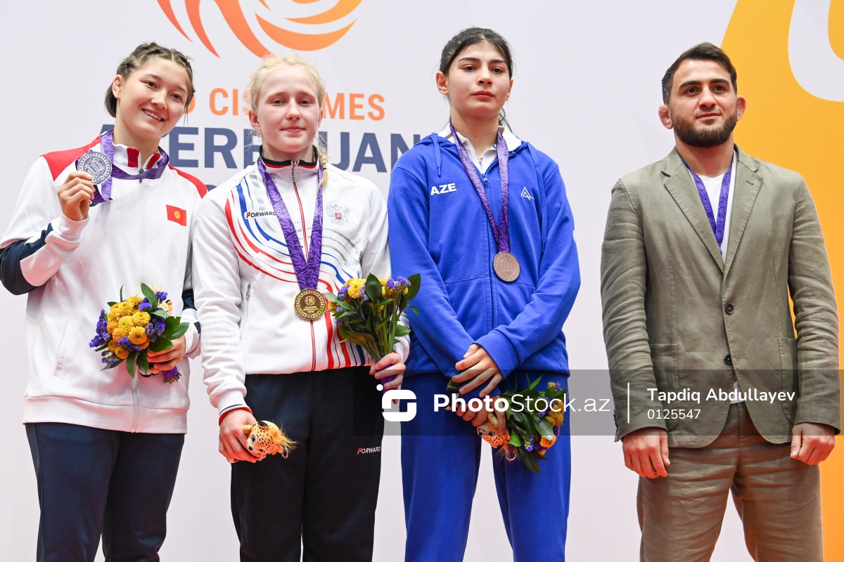 III MDB Oyunlarında 53 kq çəki dərəcəsində güləş üzrə yarışların mükafatlandırma mərasimində (soldan-sağa) gümüş medal qazanan Qırğızıstan güləşçisi Asema Torogeldieva, qızıl medal alan Rusiya təmsilçisi Margarita Larygina, bürünc medal qazanan Azərbaycan güləşçisi Xədicəxanim Talıbova və Azərbaycan Güləş Federasiyasının sərbəst güləş üzrə koordinatoru Hacı Əliyev.