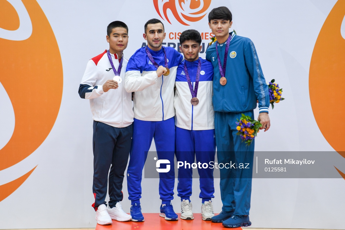III MDB Oyunlarında 67 kq çəki dərəcəsində karate üzrə yarışlarında (soldan-sağa) gümüş medal qazanan Qırğızıstan təmsilçisi Erlan Akylbek Uulu, qızıl medal alan Azərbaycan karateçisi Nuran Rzazadə, bürünc medal qazananlar Azərbaycan karateçisi Aslan Dostuyev və Özbəkistan idmançısı Abdul Vakhkhob Rashidov.