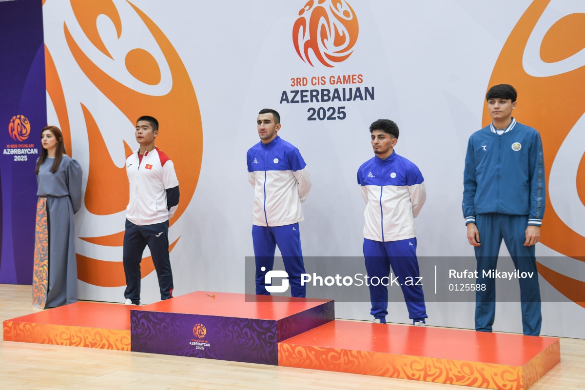 III MDB Oyunlarında 67 kq çəki dərəcəsində karate üzrə yarışlarında (soldan-sağa) gümüş medal qazanan Qırğızıstan təmsilçisi Erlan Akylbek Uulu, qızıl medal alan Azərbaycan karateçisi Nuran Rzazadə, bürünc medal qazananlar Azərbaycan karateçisi Aslan Dostuyev və Özbəkistan idmançısı Abdul Vakhkhob Rashidov.