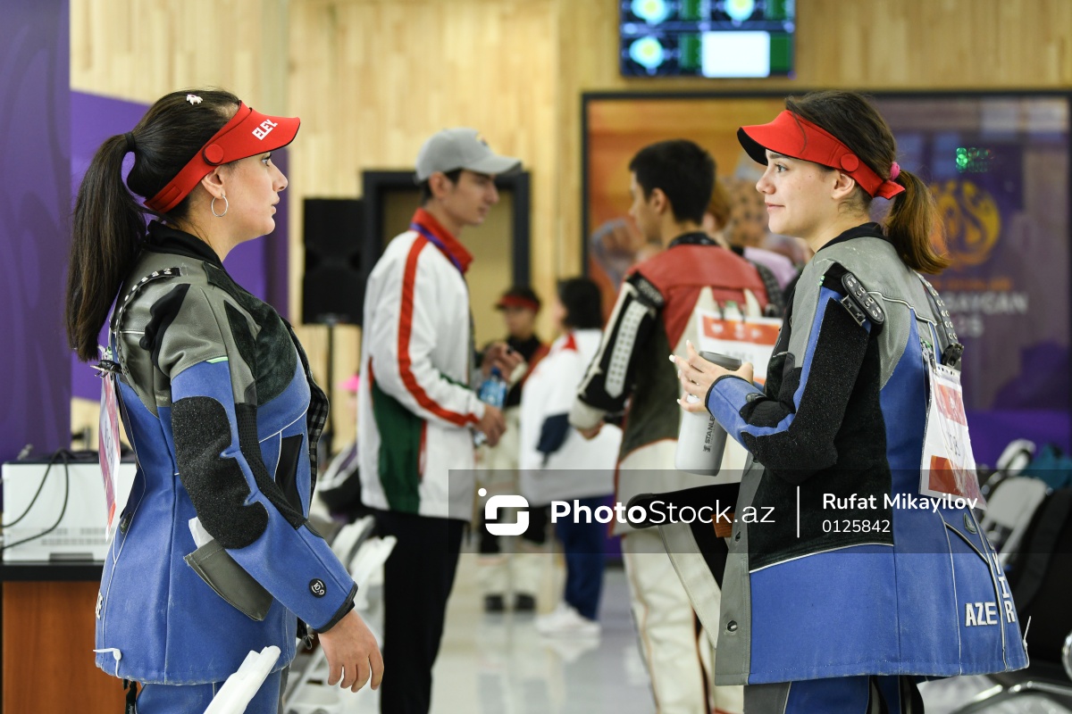 III MDB Oyunlarında güllə atıcılığı üzrə 10 metr məsafəyə atəş açma yarışlarında mübarizə aparan Azərbaycan təmsilçisiləri Nigar Ramazanova (sol) və Elvina Əfsanə (sağ).