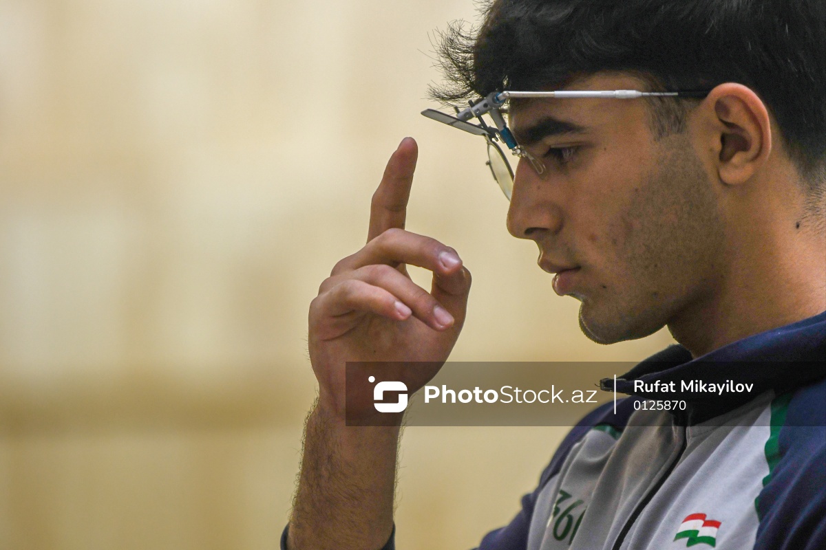 III MDB Oyunlarında güllə atıcılığı üzrə 10 metr məsafəyə atəş açma yarışlarında mübarizə aparan Tacikistan təmsilçisi Khaydarali Sattorov.