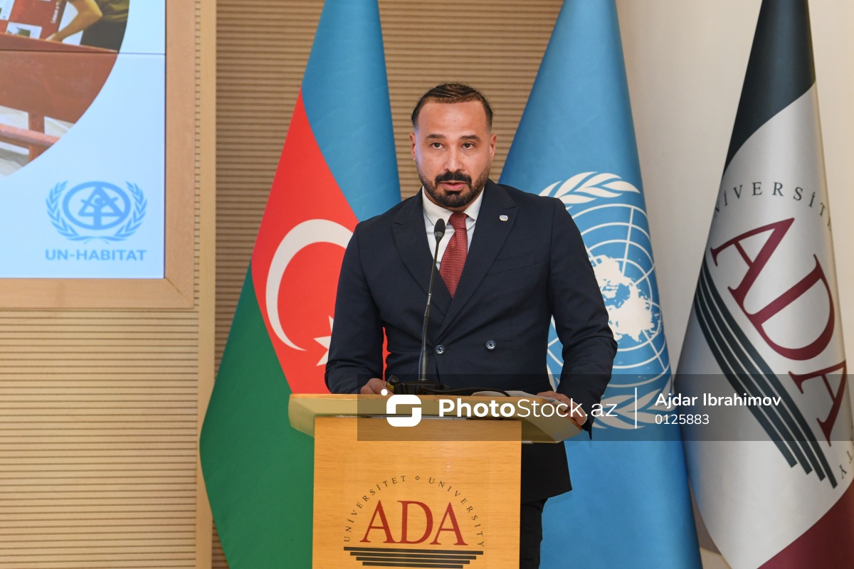 ADA Universitetində 13-cü Ümumdünya Şəhərsalma Forumu (WUF13) çərçivəsində "Azərbaycan Şəhərsalma Kampaniyası"nın təqdimatında çıxış edən Damien Thibon.