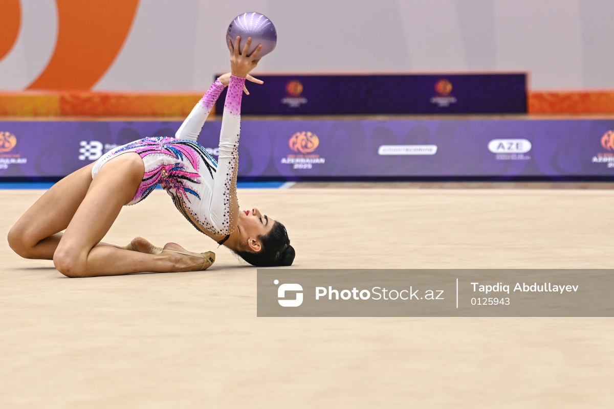 III MDB Oyunlarında bədii gimnastika üzrə yarışlarda mübarizə aparan Azərbaycan təmsilçisi Şəms Ağahüseynova.