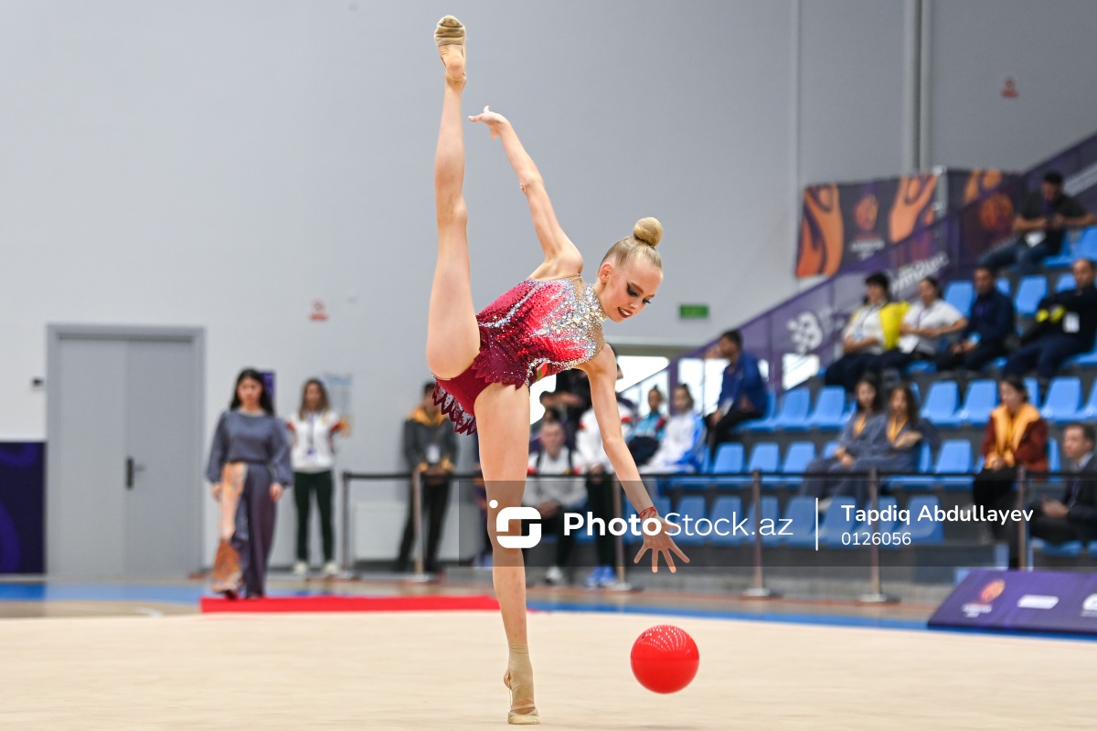 III MDB Oyunlarında bədii gimnastika üzrə yarışlarda mübarizə aparan Belarus təmsilçisi Kira Babkevich.