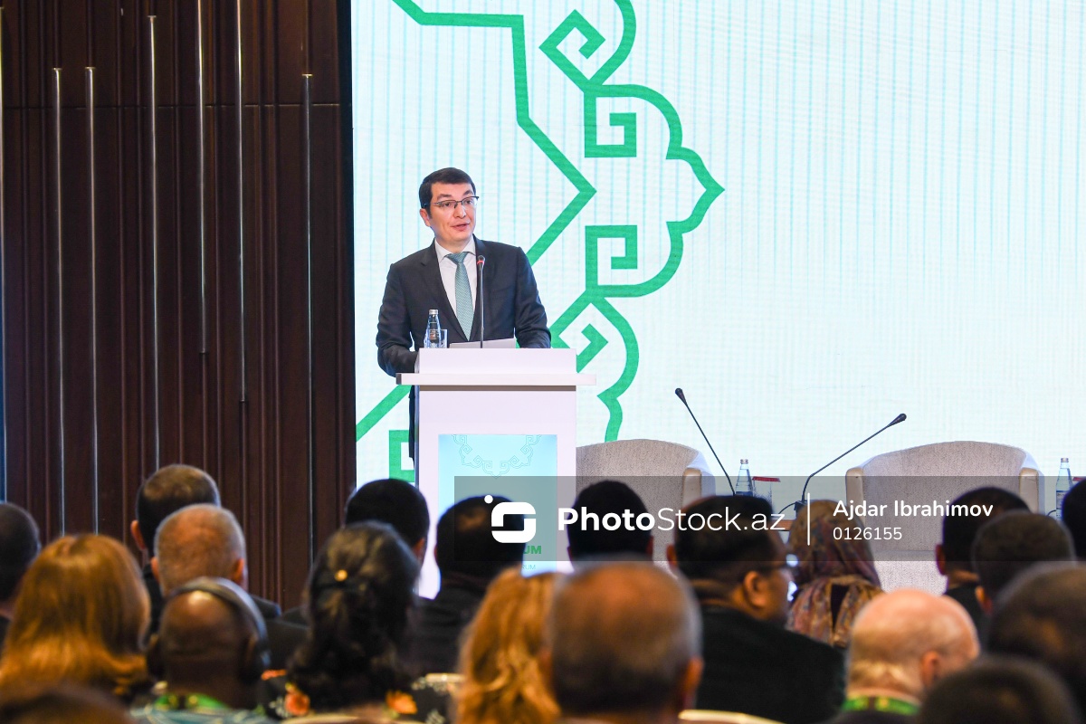 Azərbaycan Halal Biznes Forumunda çıxış edən Azərbaycan Respublikasının iqtisadiyyat nazirinin birinci müavini Elnur Əliyev.