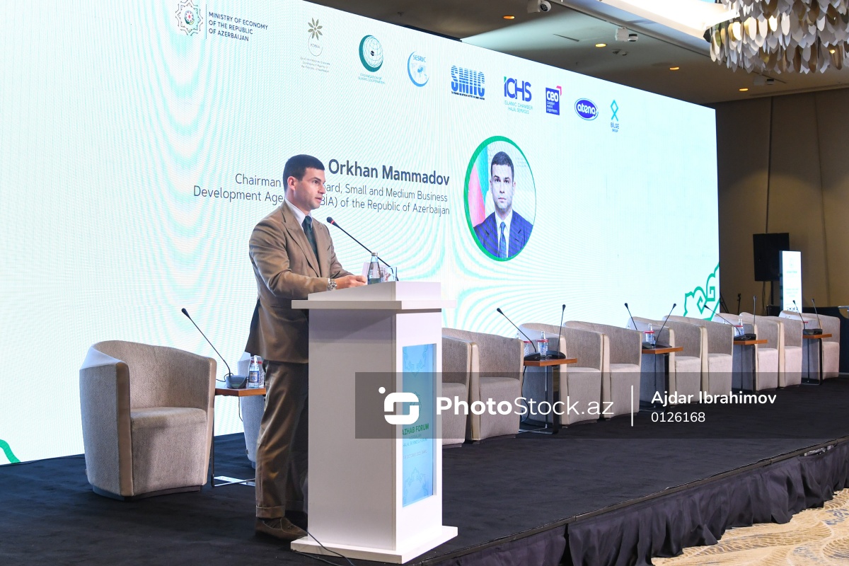 Azərbaycan Halal Biznes Forumunda çıxış edən İqtisadiyyat Nazirliyinin tabeliyindəki Kiçik və Orta Biznesin İnkişafı Agentliyinin (KOBİA) İdarə Heyətinin sədri Orxan Məmmədov.