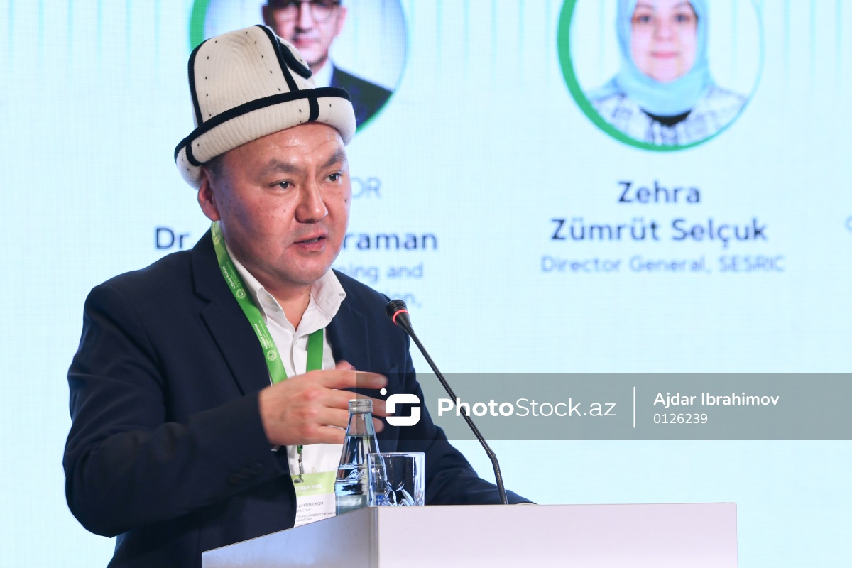 Azərbaycan Halal Biznes Forumunda çıxış edən Qırğızıstan Respublikasının İqtisadiyyat və Ticarət Nazirliyi yanında Halal Sənaye İnkişaf Mərkəzinin müdiri Almaz Kaiyrbekov.