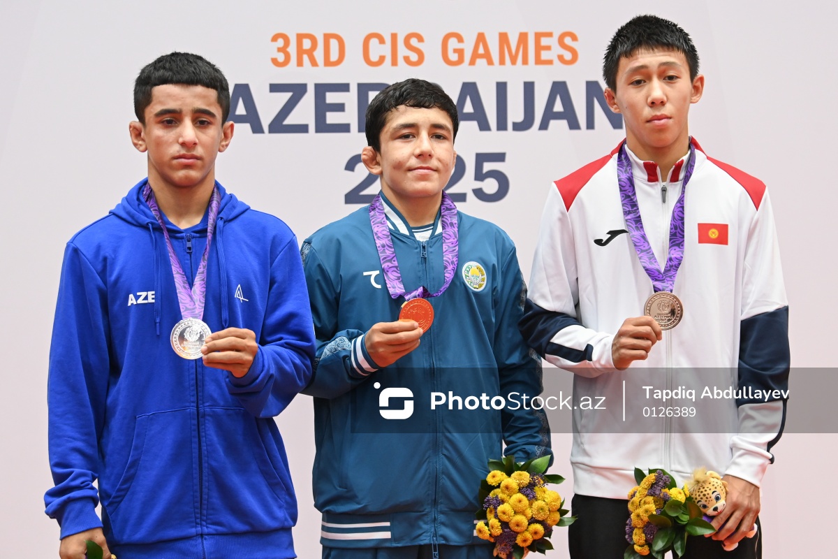 III MDB Oyunlarında yunan-Roma güləşi üzrə 48 kq çəki dərəcəsində (soldan-sağa) gümüş medal qazanan Azərbaycan güləşçisi Yusif Mirzəyev, qızıl medal qazanan Özbəkistan güləşçisi Farid Karomov və bürünc medal qazanan Qırğızıstan güləşçisi Elimbek Abdykerimov.