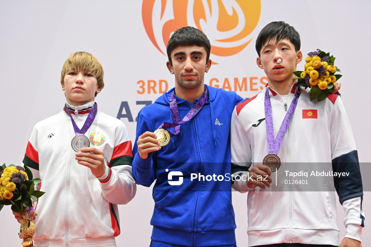 III MDB Oyunlarında yunan-Roma güləşi üzrə 51 kq çəki dərəcəsində (soldan-sağa) gümüş medal qazanan Belarus güləşçisi Semianenka Tsimafei, qızıl medal qazanan Azərbaycan güləşçisi Elşad Abbasov və bürünc medal qazanan Qırğızıstan güləşçisi Beknazar Emilbekov.