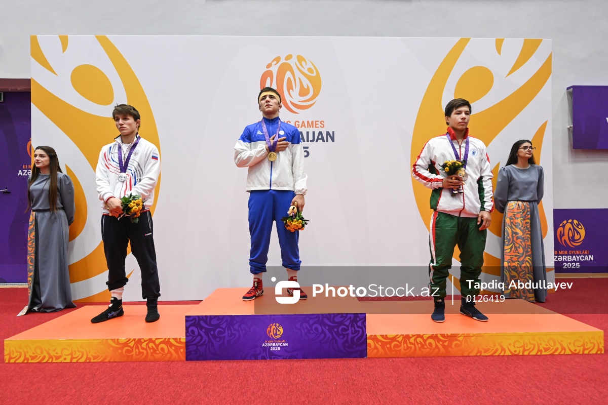 III MDB Oyunlarında yunan-Roma güləşi üzrə 60 kq çəki dərəcəsində (soldan-sağa) gümüş medal qazanan Rusiya güləşçisi Ivan Kozlov, qızıl medal qazanan Azərbaycan güləşçisi Əli Nəzərov və bürünc medal qazanan Belarus güləşçisi Vasko Kiryl.
