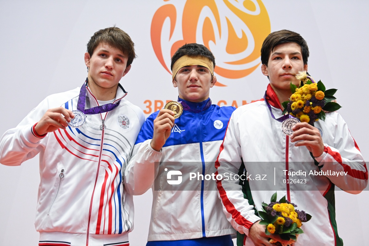 III MDB Oyunlarında yunan-Roma güləşi üzrə 60 kq çəki dərəcəsində (soldan-sağa) gümüş medal qazanan Rusiya güləşçisi İvan Kozlov, qızıl medal qazanan Azərbaycan güləşçisi Əli Nəzərov və bürünc medal qazanan Belarus güləşçisi Vasko Kirıl.