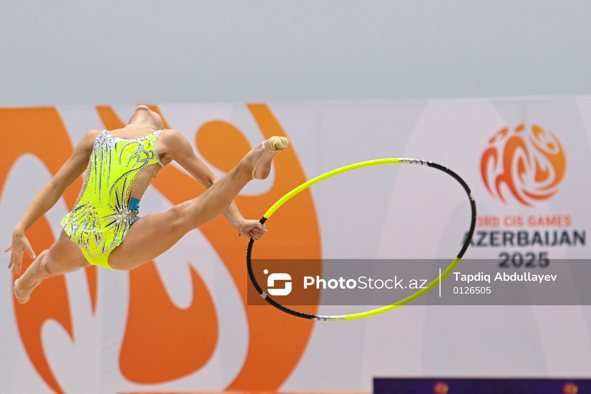 III MDB Oyunlarında bədii gimnastika üzrə yarışlarda mübarizə aparan Qazaxıstan təmsilçisi Linara Zaylauova.