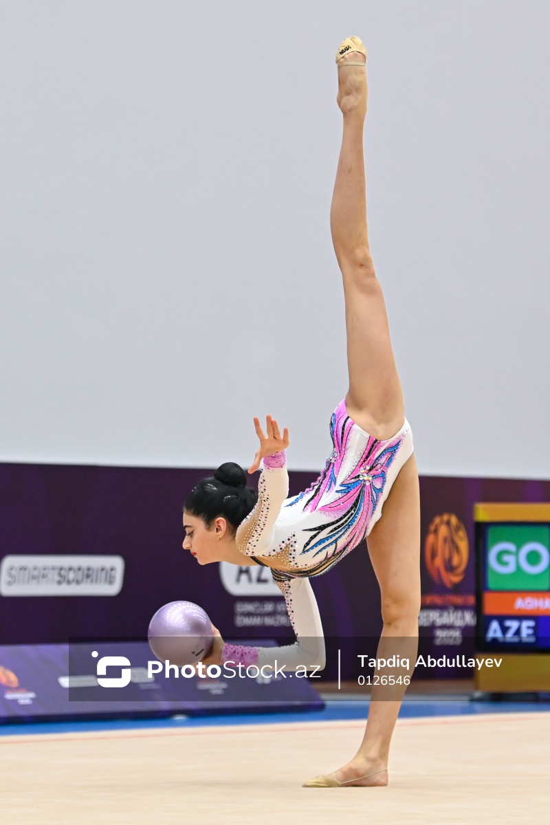 III MDB Oyunlarında bədii gimnastika üzrə yarışlarda mübarizə aparan Azərbaycan təmsilçisi Şəms Ağahüseynova.