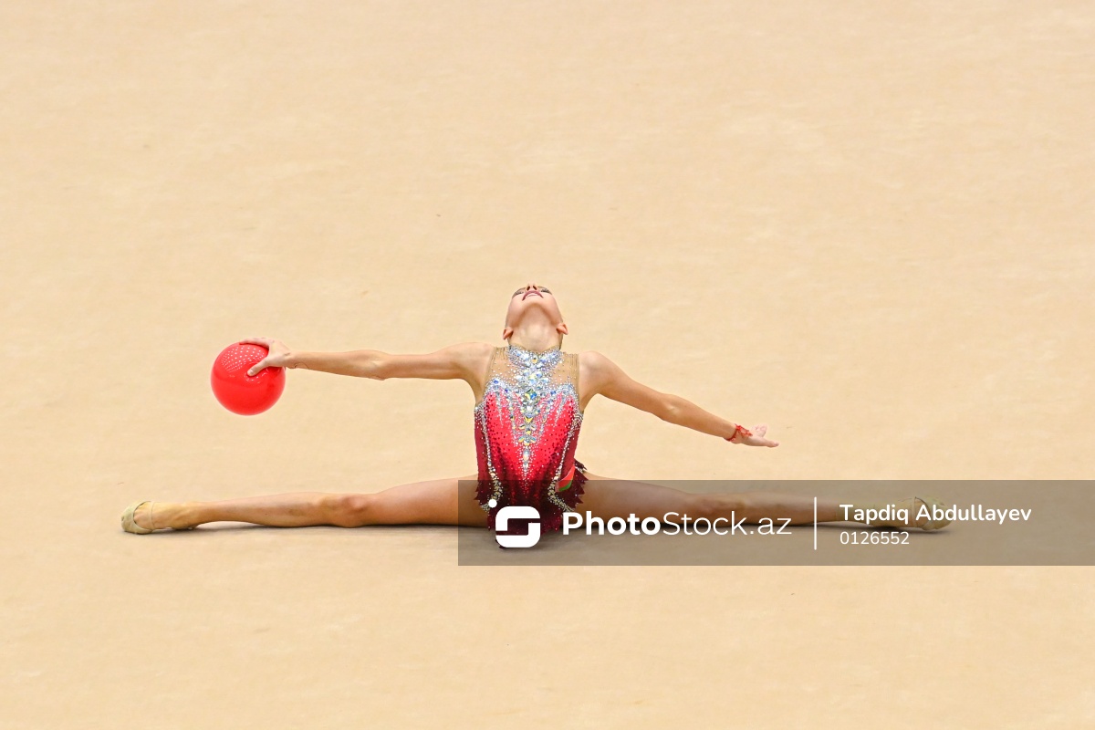 III MDB Oyunlarında bədii gimnastika üzrə yarışlarda mübarizə aparan Belarus təmsilçisi Kira Babkeviç.